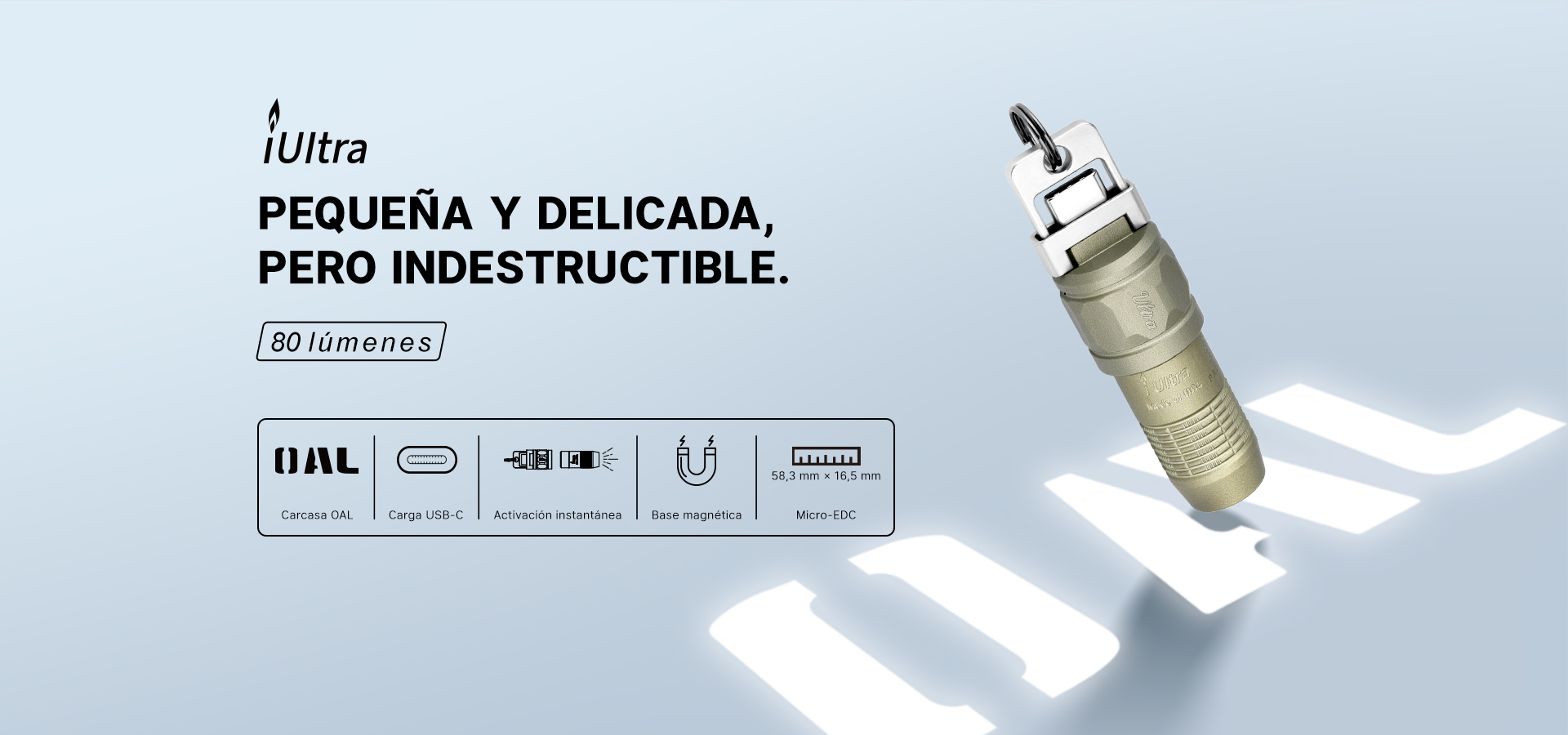 La linterna micro-EDC Olight iUltra redefine lo que debe ser una linterna de llavero para uso diario (EDC). Fabricada con aluminio OAL™ exclusivo de Olight, es una de las linternas de llavero más resistentes del mercado, capaz de convivir sin problemas con llaves, monedas o multiherramientas sin sufrir arañazos visibles.